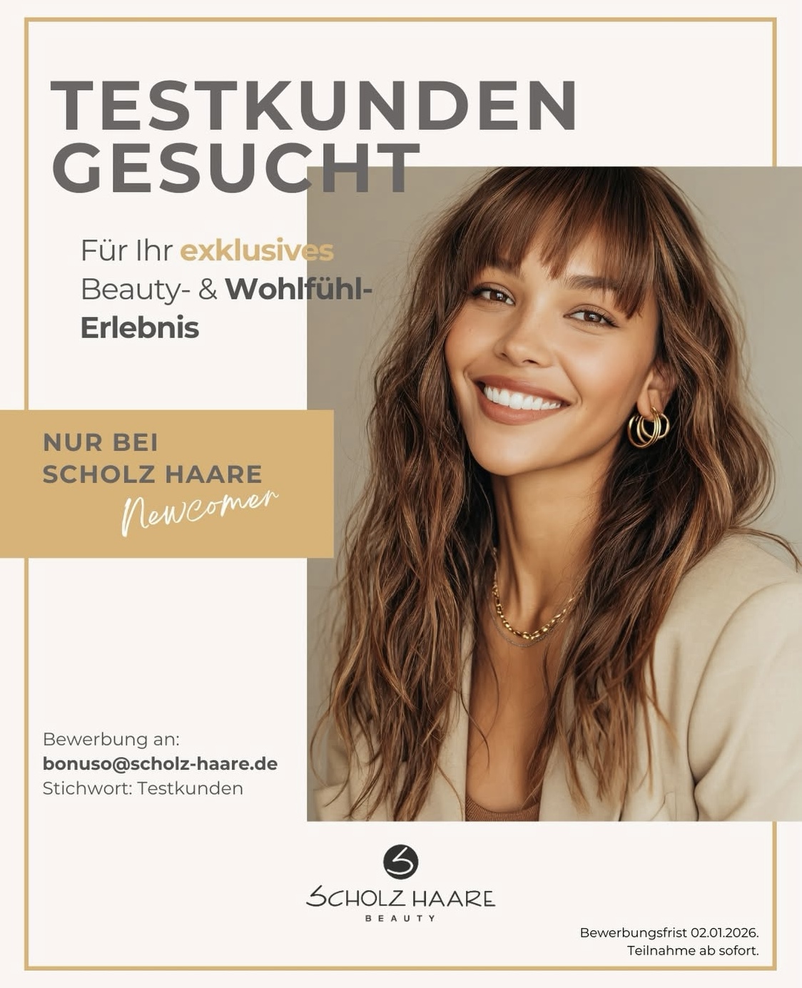So bewirbst Du Dich: einfach eine E-Mail mit Deinem Namen, Deinem Alter und dem Behandlungswunsch an bonuso@scholz-haare.de.